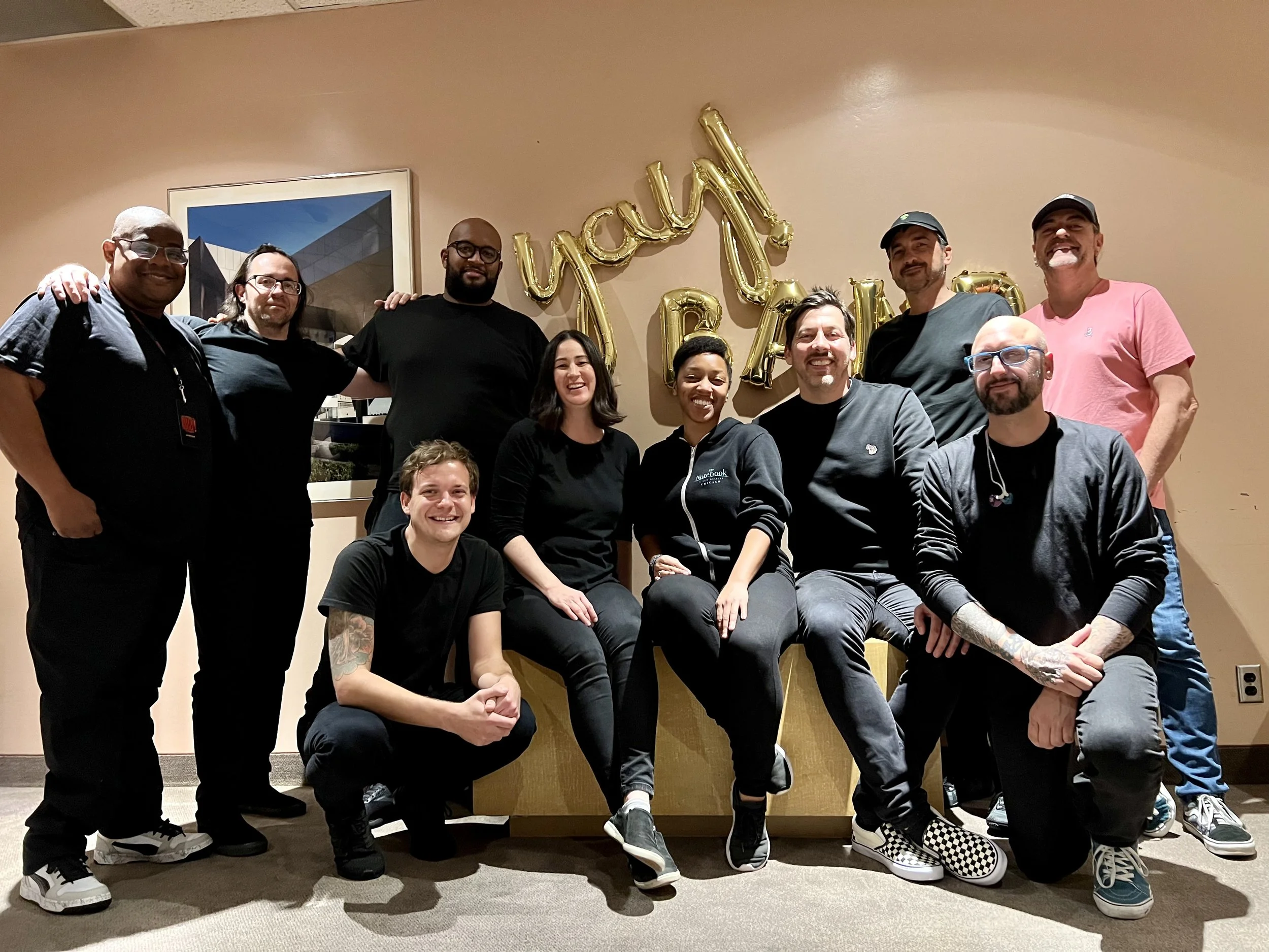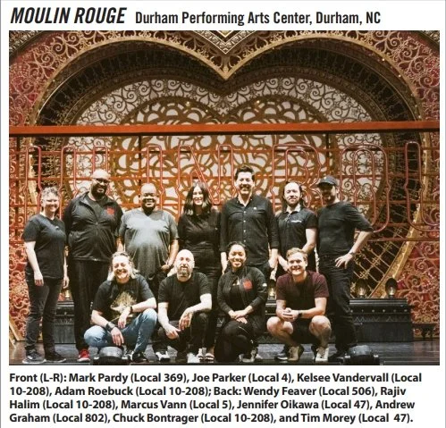 Moulin Rouge! first national tour orchestra, November, 2024. From left to right: Kelsee Vandervall, 'cello; Wendy Feaver, key 2/asst. conductor; Adam Roebuck, trumpets and co-steward; Tim Morey, guitar 1; Joe Parker, guitar 2; Andrew Graham, key 1/conductor; Chuck Bontrager, violin/viola and co-steward; Flint Hawes, (incoming) key 2/asst. conductor; Mark Pardy, drums/percussion; Marcus Vann, basses; Rajeev Halim, woodwinds.